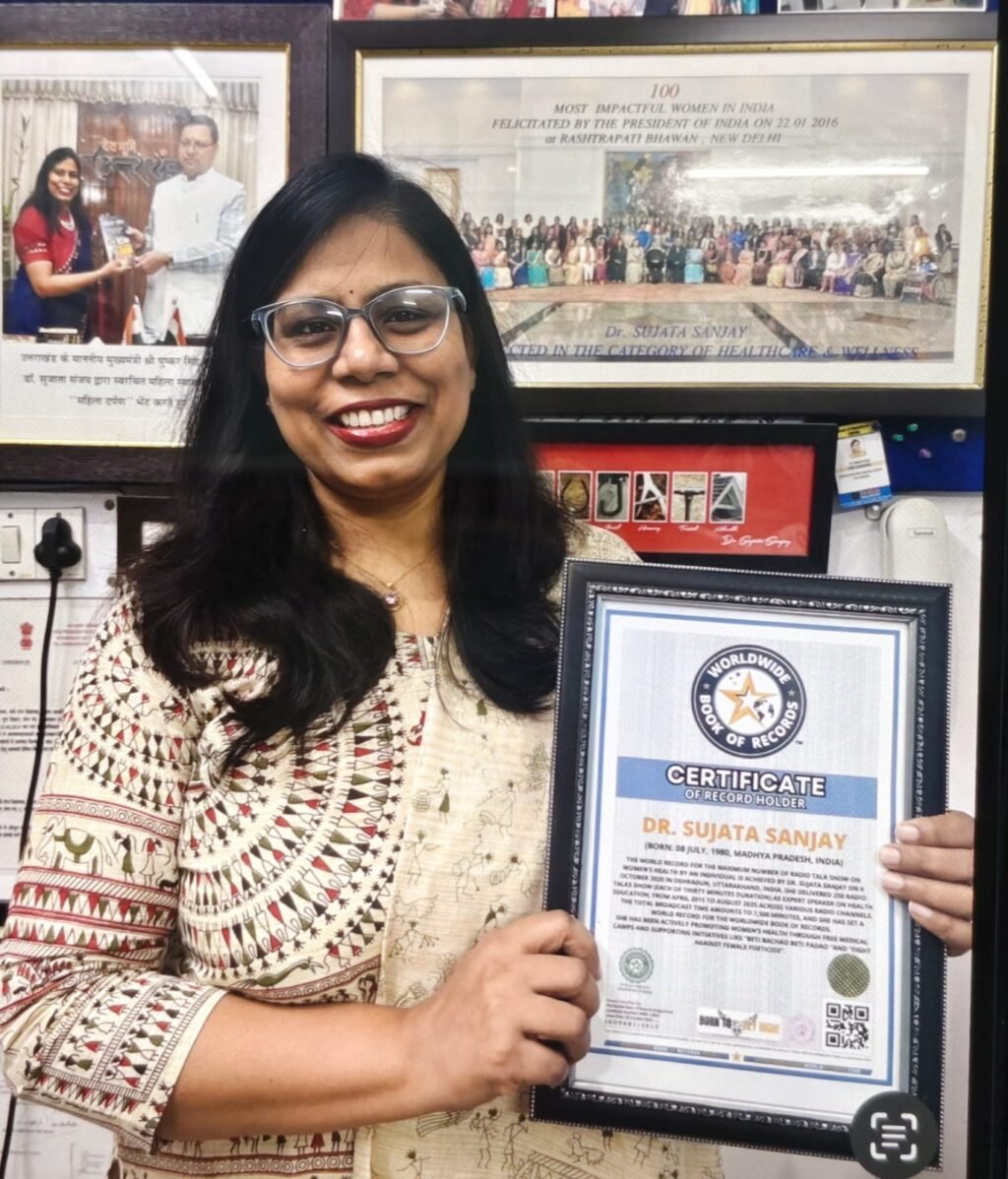 देहरादून। महिलाओं के स्वास्थ्य और जागरूकता को समर्पित कार्यों के लिए प्रसिद्ध संजय ऑर्थोपेडिक स्पाइन एंड मैटरनिटी सेंटर की स्त्री एवं प्रसूति रोग विशेषज्ञ डॉ. सुजाता संजय ने एक बार फिर नया कीर्तिमान स्थापित किया है। हाल ही में उन्होंने 250 से अधिक स्वास्थ्य संबंधी रेडियो टॉक शो पूरे किए हैं, जिसके लिए उनका नाम वर्ल्ड वाइड बुक ऑफ रिकॉर्ड्स में दर्ज किया गया है। डॉ. सुजाता का यह सफर समाज के प्रति उनके समर्पण की मिसाल है। इससे पहले वर्ष 2017 में उनके नाम इंडिया बुक ऑफ रिकॉर्ड्स में भी कीर्तिमान दर्ज किया गया था कृ जब उन्होंने 187 से अधिक निःशुल्क स्वास्थ्य परामर्श शिविरों का आयोजन कर 5500 से भी अधिक महिलाओं को स्वास्थ्य लाभ पहुँचाया था।