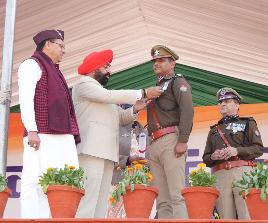 देहरादून। परेड ग्रांउड में 76वें गणतंत्र दिवस के अवसर पर राज्यपाल लेफ्टिनेंट जनरल गुरमीत सिंह (से नि) ने पुलिस अधिकारियों को सम्मानित किया। जिन अधिकारियों/कर्मचारियों को उत्कृष्ट सेवा के लिए पदक प्रदान किये गये उनमें चक्रधर अन्थवाल, अपर पुलिस अधीक्षक, आईआरबी द्वितीय उत्तराखण्ड। (विशिष्ट सेवा के लिए राष्ट्रपति का पुलिस पदक), नवनीत सिंह, वरिष्ठ पुलिस अधीक्षक, एसटीएफ उत्तराखण्ड। (सराहनीय सेवा के लिए पुलिस पदक),योगेश चन्द, पुलिस उपाधीक्षक, अभिसूचना मुख्यालय। (सराहनीय सेवा के लिए पुलिस पदक), भूपेन्द्र सिंह भंडारी, पुलिस उपाधीक्षक, ऊधमसिंह नगर। (सराहनीय सेवा के लिए पुलिस पदक), रविन्द्र कुमार वर्मा (से नि), उप निरीक्षक स0पु0, देहरादून। (सराहनीय सेवा के लिए पुलिस पदक), देवेन्द्र सिंह, अग्निशमन द्वितीय अधिकारी, देहरादून। (राष्ट्रपति का अग्निशमन विशिष्ट सेवा पदक), दिनेश चन्द्र पाठक, लीडिंग फायरमैन, बागेश्वर। (अग्निशमन सराहनीय सेवा पदक), लक्ष्मण सिंह नेगी, लीडिंग फायरमैन, अल्मोड़ा। (अग्निशमन सराहनीय सेवा पदक), गिरीश सिंह बिष्ट, अग्निशमन अधिकारी, ऊधमसिंह नगर। (अग्निशमन सराहनीय सेवा पदक), दिनेश चन्द्र भट्ट, फायर सर्विस चालक, देहरादून। (अग्निशमन सराहनीय सेवा पदक) शामिल हैं।